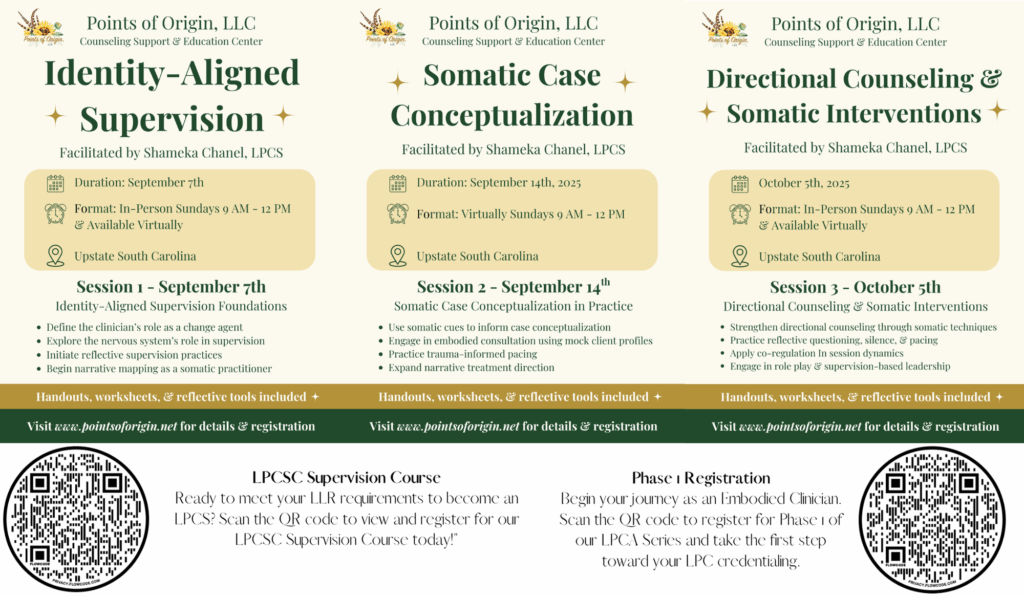 At Points of Origin Counseling & Education Center, our internship and supervision programs are built to shape not just future clinicians—but reflective, embodied leaders. We provide a dynamic, structured pathway for clinical interns, administrative interns, and licensed professionals seeking LPCS candidacy to grow through intentional training, ethical practice, and trauma-informed care.